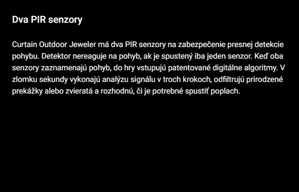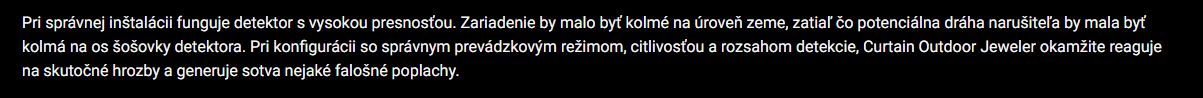 Curtain Outdoor Jeweler je detektor pohybu na obvodovú ochranu priestoru s výnimočnou presnosťou a takmer nulovou pravdepodobnosťou falošných poplachov. Vďaka jedinečnému optickému systému sa zariadenie pozerá na úzke sektory dlhé až 12 m. Duálna technológia detekcie pohybu využívajúca dva PIR senzory a jeden mikrovlnný senzor v pásme Ka umožňuje odfiltrovať falošné poplachy spôsobené tepelným šumom, zvieratami alebo rastlinami. Detekčný rozsah a režim PET imunity sa konfigurujú pomocou posúvača na kryte detektora a citlivosť sa konfiguruje v aplikáciách Ajax tak, aby vyhovovala špecifickým potrebám lokality. Predinštalované batérie zaisťujú stabilný výkon až na tri roky.