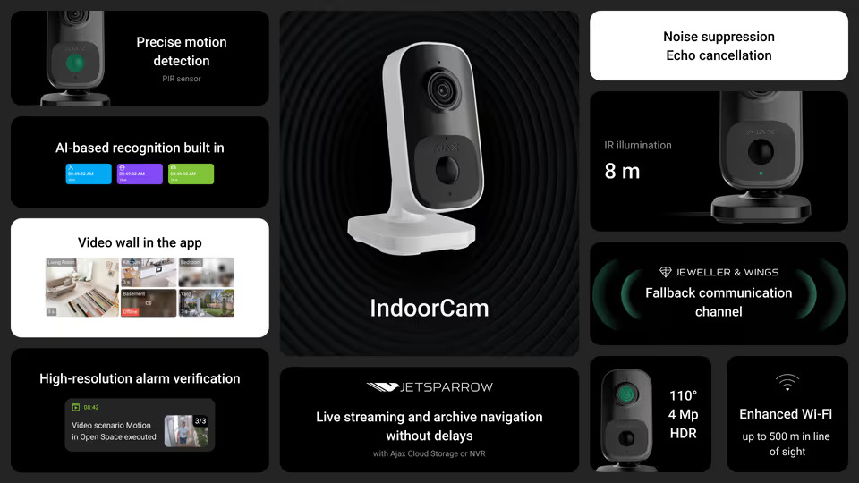 Kamera Ajax IndoorCam mení všetko. Je určená pre domácnosti, malé kancelárie, malé až stredné podniky a kombinuje flexibilitu Wi-Fi s profesionálnymi bezpečnostnými štandardmi Ajaxu. Vďaka záložnému komunikačnému kanálu prostredníctvom rádiového protokolu Jeweller, vstavanej umelej inteligencii a šifrovanému prenosu dát zabezpečuje IndoorCam spoľahlivé monitorovanie bez kompromisov. Kamera, ktorá bola prvýkrát predstavená na špeciálnej akcii Ajax: Multiverse, stelesňuje ďalší krok v inteligentnom zabezpečení a ponúka stabilitu, súkromie a bezproblémovú integráciu s bezpečnostným systémom Ajax.