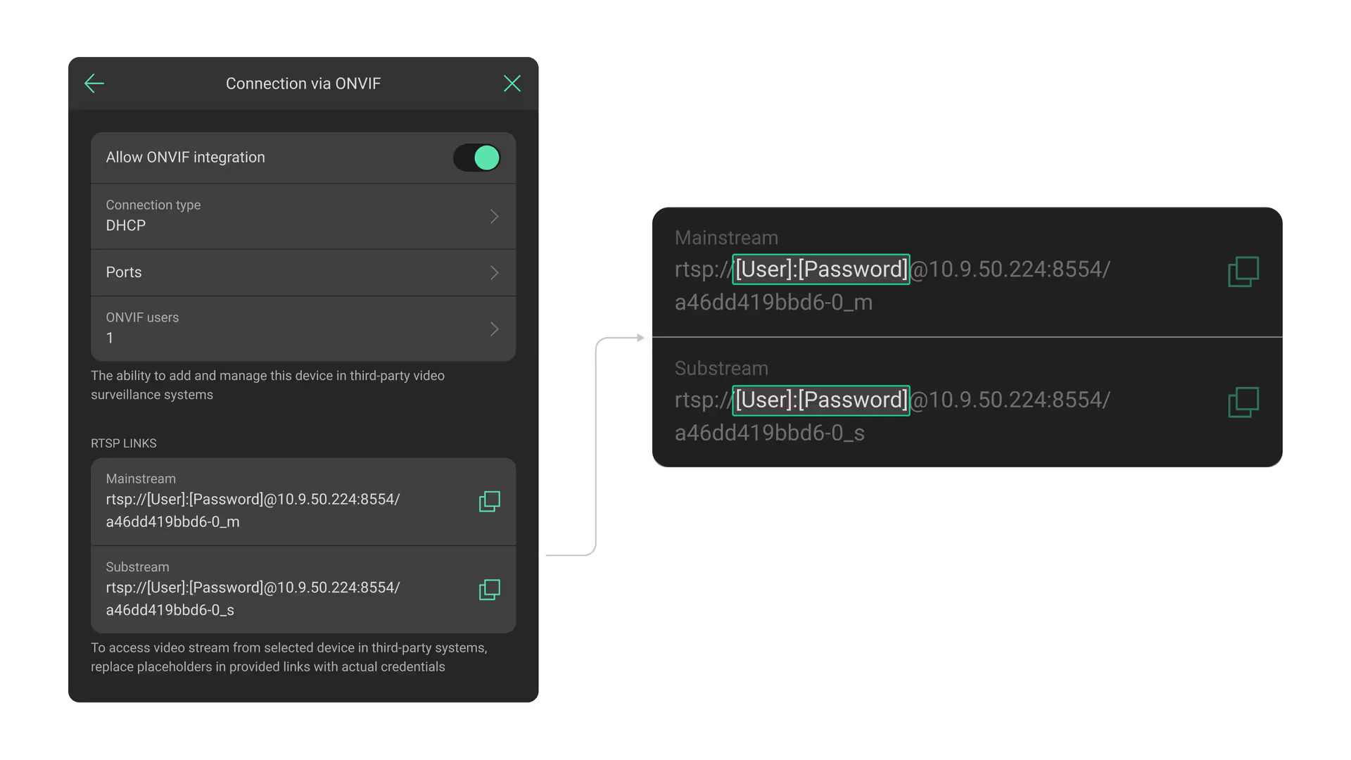 Sprievodca tiež automaticky vygeneruje RTSP linky pre hlavný aj vedľajší stream. Ak váš VMS nepodporuje ONVIF, môžete použiť tieto odkazy na priame prehrávanie videa. Jednoducho skopírujte vygenerované odkazy a nahraďte hodnoty zástupných symbolov skutočnými prihlasovacími údajmi, ktoré ste predtým priradili.