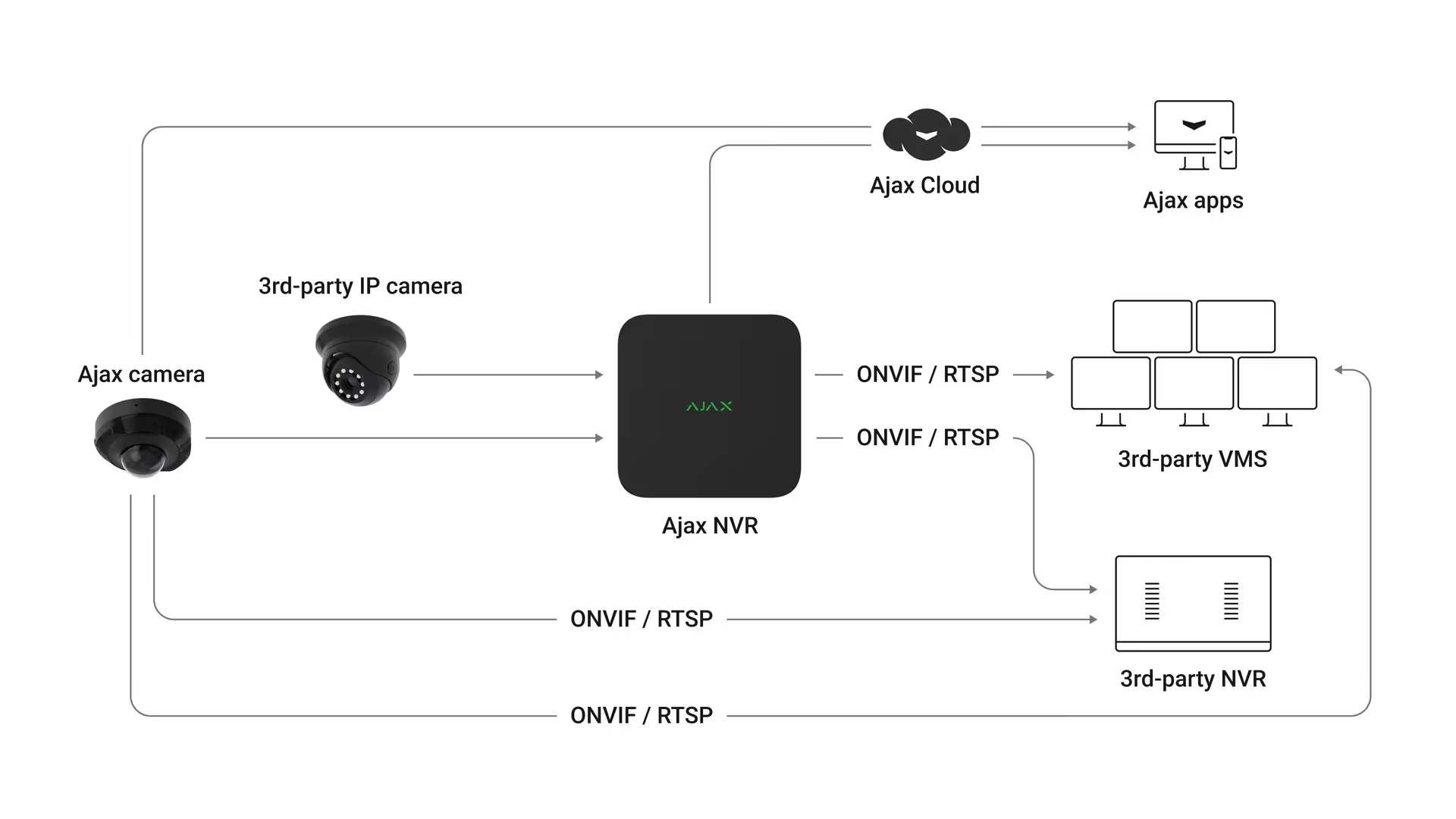 Vďaka autorizácii ONVIF môžu teraz kamery a NVR Ajax prenášať video streamy priamo klientom tretích strán pomocou štandardného protokolu ONVIF, čím obchádzajú Ajax Cloud. Táto implementácia podporuje ONVIF Profile S, ktorý umožňuje streamovanie videa a zvuku na báze RTSP, ako aj kódovanie H.264 pre kompresiu videa. Profil S je zlatým štandardom ONVIF a bežne ho používa väčšina výrobcov sledovacích systémov. Vďaka tomu možno zariadenia Ajax ľahko integrovať s veľkou väčšinou existujúcich systémov na správu videa.