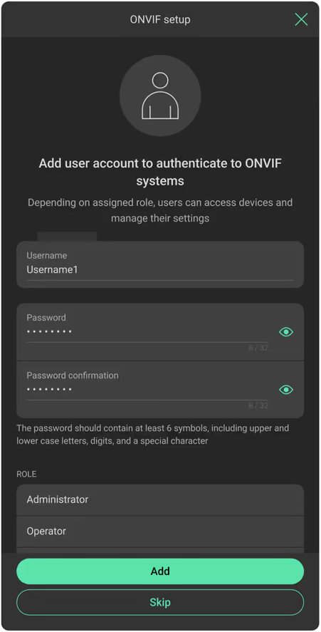 Na jedno zariadenie Ajax možno vytvoriť až päť používateľov ONVIF. Každý používateľ musí mať pridelené jedinečné overovacie údaje — používateľské meno a heslo. Používateľom možno priradiť jednu z troch dostupných rolí: