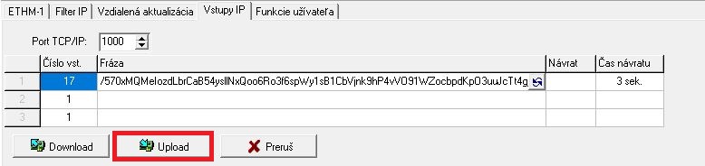 Na záver kliknite dole na "Upload", pretože nastavenia IP zón sa ukladajú priamo do komunikátora, nie do ústredne.