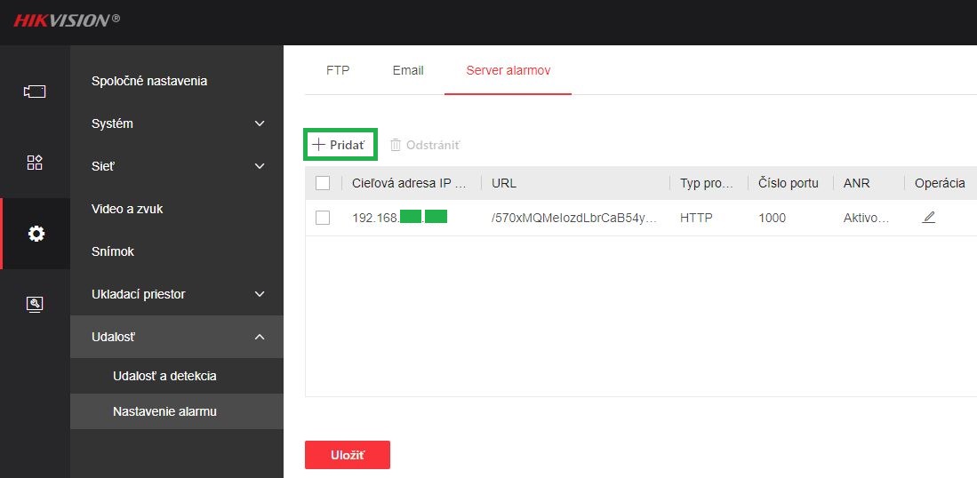 V konfigurácií kamery v časti "Udalosť" zvoľte "Nastavenie alarmu" a potom "Server alarmov".