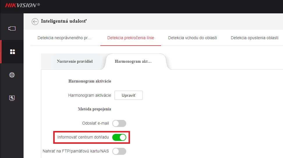 Na záver si už len povoľte a nastavte nejakú udalosť na kamere, ktorá Vám bude hlásiť poplach do ústredne - napríklad "Detekcia prekročenia čiary".