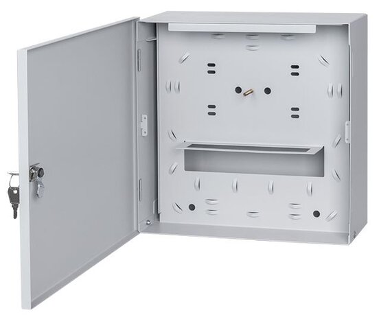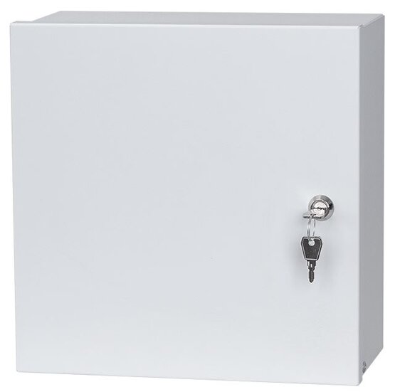Univerzálna montážna skrinka 300×300×100, so zámkom, montážnou doskou a káblovým vstupom, biela, IP20